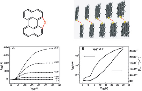 在p型有机半导体材料方面,研究人员将稠环芳烃体系和噻吩功能单元有机地结合起来,设计合成出基于硫杂苝的小分子有机功能分子体系,利用硫杂苝功能分子制备了薄膜及微纳晶场效应管器件并测试了基本性能,发现噻吩单元的引入导致功能分子具有非常独特的双通道超结构,多重超分子自组装作用的协同效应导致其微纳晶场效应管迁移率高达