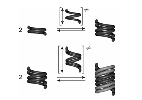 研究人员通过片段加倍合成法,成功地合成了分别含有2,4,8个喹啉酰胺结构单元的寡聚物。这些寡聚物通过分子内F---NH和N---NH氢键自组装成为单、双螺旋和四螺旋超分子体系(图1和2)。研究表明无论是在晶体中,还是在溶液中,这些多肽寡聚物都呈现相同的螺旋结构。研究人员还发现单螺旋必须通过增加螺旋间的距离才能够组装成为双螺旋超分子体系,并在此基础上提出了多螺旋结构形成的弹簧伸展原理(图3)。这和短杆菌肽(Gramicidin D)有着十分相似的自组装机理。这些研究结果为探索合成新型人工合成折叠分子及其超分子结构提供了新途径。论文被接受后不久,Angew. Chem. Int. Ed.把该论文选为“Hot Paper”。