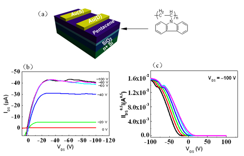 OFETs的器件结构(a)及器件的输出(b)和转移曲线(c)