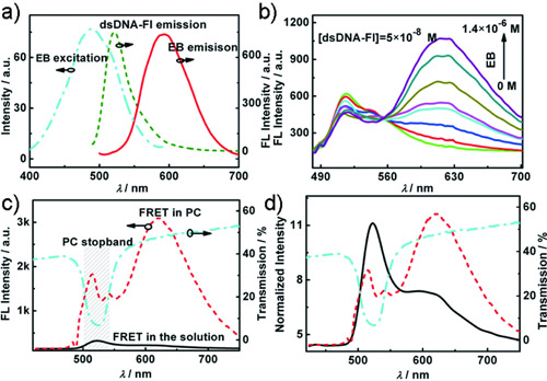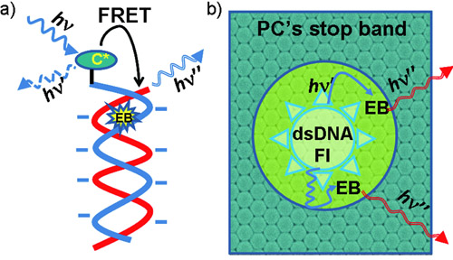 在以上研究基础上,通过与化学所王树研究员等合作,并结合荧光共振能量转移(FRET)技术,他们提出了一种新的高灵敏度的 DNA 检测方法。他们将光子晶体引入到基于荧光共振能量转移的 DNA 检测体系中,利用光子晶体禁带有效抑制了给体能量的损失,控制了给体能量的衰减方式,将给体光有效地局域化,大大提高了能量传递的效率,使检测灵敏度得到了数百倍的提高,检测限达到 13.5 fM。并且利用光子晶体参与的 DNA 检测体系,实现了常温下 DNA 单个碱基对不匹配的识别。这一研究结果为发展基于光子晶体的高灵敏生物检测芯片提供了新的思路。该研究结果发表在近日出版的《德国应用化学》(Angew. Chem. Int. Ed. 2008, 47, 7258-7262), 并被Nature China选为研究亮点报道。