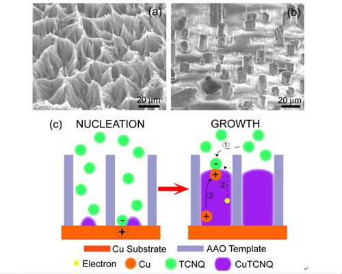 在上述工作的基础上,该课题组利用纳米孔道模板在形貌控制方面的优势,结合简单的浸渍法实现了快速、低成本制备形貌均一、尺寸可控的CuTCNQ单晶纳米线阵列。并且发现在受限的纳米尺度空间中,CuTCNQ晶体的生长具有在宏观尺寸下不同的新奇特征。为了解释这一现象,他们采用交流阻抗谱和直流极化谱分析并证实了CuTCNQ晶体具备Cu离子传导能力,并在此基础上提出一种新的生长机理来描述CuTCNQ晶体纳米线的生长过程,即CuTCNQ晶体纳米线的生长主要依靠晶体对Cu离子的传导进行化学传质而在顶端生长。