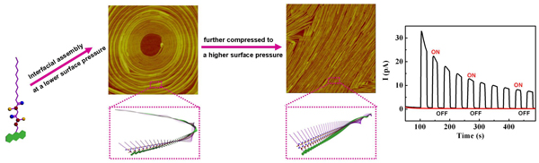 研究人员选用一种蒽衍生物,对衍生物进行了界面的超分子组装,通过改变界面组装的表面压来调控分子间p-p交叠程度,进而可控地制备了纳米线圈和直线状纳米纤维超分子组装体。这两种纳米结构表现了不同的光电流开关特性。在较低表面压下,得到纳米线圈形貌,由于分子间的p-p交叠程度较小,而且载流子迁移率较低,不具有光电响应性质。当表面压力升高时,该纳米线圈可以转变成直线状纳米结构,相邻分子间p-p交叠增大,同时载流子迁移率增加,在光照射下表现出显著的光电开关特性。此外,由于p-p堆积方式的改变以及界面组装的协同相互作用,这些不具有手性的分子体系通过界面的组装还表现出了超分子手性。该研究表明,有机构筑基元的界面组装为控制纳米材料的形貌及光电性质提供了一种简便的方法,同时也表明,圆二色光谱不仅可以用来表征组装体的手性,也可能用来关联功能p-分子之间的相互作用。