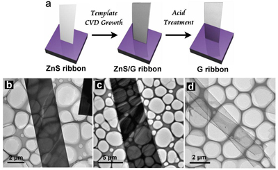 图2 a)制备石墨烯带的示意图及其b)硫化锌带、c)硫化锌/石墨烯带和d)石墨烯带的透射电子显微镜照片。
