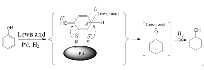 图2. 路易斯酸与钯协同催化苯酚加氢生成环己酮和路易斯酸稳定环己酮示意图