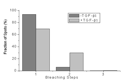 研究人员运用单分子荧光成像技术,控制受体在细胞膜上的表达量,实现了细胞膜上单个TGF-β受体的实时成像。通过对TGF-βII型受体单分子荧光强度和单分子荧光漂白步数的统计,发现该受体静息状态下主要以单体形式存在,配体刺激后二聚体的比例显著增加。同时还发现这种二聚体的形成并不受细胞是否表达TGF-βI型受体的影响。表明TGF-βII型受体与表皮生长因子受体EGFR等酪氨酸激酶一样,具有配体诱导单体二聚的激活方式。对于处于静息状态的细胞,当受体表达量增加时,能形成二聚体等寡聚体。这解释了为何以往基于过量表达受体的生化研究结果没有发现II型受体的单体形式,而认为II型受体等例外地在激活前就以二聚体形式存在。综合这些结果,研究人员提出配体诱导单体发生二聚的受体激活模型对于TGF-βII型受体这种丝氨酸/苏氨酸激酶类受体仍然适用的新观点。