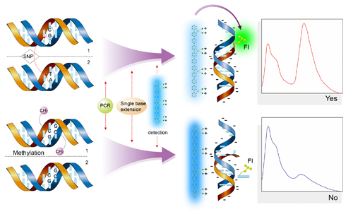 在这篇综述论文中,作者结合国内外该领域的发展趋势,重点综述了该课题组近几年来利用阳离子共轭聚合物荧光探针以及荧光共振能量转移技术在DNA单核苷酸多态性(SNP)、DNA甲基化以及DNA损伤检测与传感三个方面的研究进展。这些新型检测技术具有较高的灵敏度和特异性,引物无需染料标记,检测在均相溶液中进行,无需分离、纯化步骤,在重大疾病早期高灵敏诊断、药物设计以及个体化用药等方面具有重要应用前景。