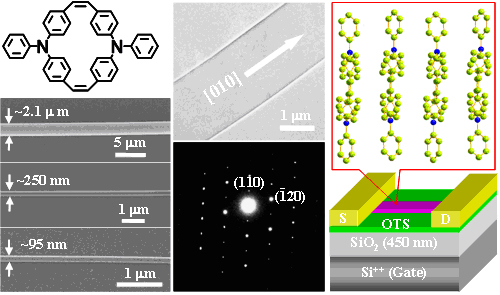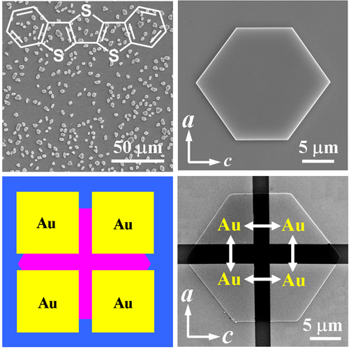 晶体的各向异性,是分子材料的本征性能之一。但有机晶体多数以微纳晶的形式存在,因而其各向异性的研究一直是个挑战性的课题。针对这一挑战性课题,研究人员控制合成了一种并五苯类似物的六角状微纳单晶,采用单个六角微晶,利用有机纳米线模板法,在单个微晶上分别构筑了4个和6个电极,利用单个微纳晶成功实现了各向异性传输特性的研究,获得了晶体沿不同晶面、不同晶向传输的迁移率,其沿c轴的迁移率最高达1.8 cm2V-1s-1 ,开关比>107,各向异性比在2-2.5。结果证实:分子堆积越紧密、分子间作用力越强,迁移率越高。相关结果为分子材料的调控合成提供了直接的实验依据(Adv. Mater. 2009, 21, 4492-4495)。