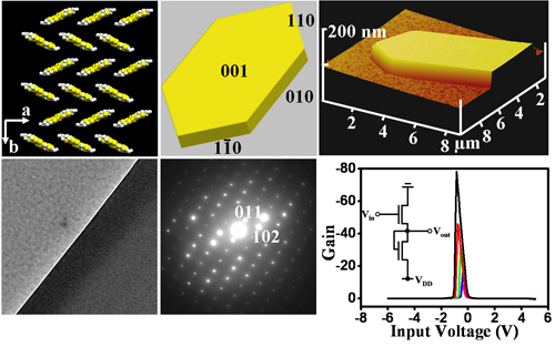 此外,他们还控制合成了一种新型蒽化合物,二苯乙烯蒽的微纳单晶,采用有机单晶微纳线模板法制备了其高性能的场效应晶体管,其最高迁移率达到4.3 cm2V-1s-1。利用这种高性能微纳单晶场效应晶体管制备了高性能的反相器,其最大增益达到80。最后,研究了单晶的传输特性表现出各向异性的特点,沿a轴和b轴方向的迁移率比在1.5-1.95 (μa/μb)。这项研究,为高性能单晶分子电路的研究奠定了基础。相关结果发表在Adv. Mater. 2009, 21, 3649-3653上。