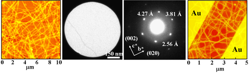 在小分子材料成功研究的基础上,他们和高分子物理与化学国家重点实验室、美国加州大学圣巴巴拉分校合作,开展了共轭高分子微纳晶的研究。通常,共轭高分子形成无序的薄膜,这导致高分子膜的迁移率较低、获取高分子本征性能、评价高分子困难。他们采取控制组装的方法,获得了聚苯乙炔高质量的单晶纳米线。首次对共轭高分子纳米线的晶态结构、分子堆积进行了解析。证实聚苯乙炔纳米线是一种正交晶系,晶格参数a,b,c分别为13.63 ?, 7.62 ?, 5.12 ?。在纳米线内,分子链沿着纳米线的长轴方向堆积、侧链垂直基板排列。进而,他们采用纳米线模板法构筑了聚苯乙炔纳米线的场效应晶体管。晶体管的研究结果显示,其场效应迁移率在10-2 cm2/Vs,最高达到0.1 cm2/Vs,比同等条件下其薄膜的场效应迁移率搞3-4个量级。这些研究结果,为揭示共轭高分子的本征性能,构筑高性能分子纳米器件、推动其应用奠定了基础。相关结果发表在J. Am. Chem. Soc. 2009, 131, 17315-17320上。