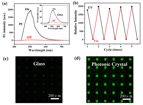 图2 (a) 存储薄膜在优化光子晶体和玻璃(插图)表面上的荧光光谱的变化及在光子晶体表面存储薄膜的荧光峰强度的可逆变化循环 (b);(c, d) 在玻璃和光子晶体表面的存储薄膜经掩膜在紫外光照射下形成的荧光信息存储图案。