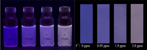 在以前的研究工作中,对氟离子的检测往往很难做到在水溶液中的实现,并且由于检测过程受到其它多种阴离子的干扰,专一性受到限制。研究人员在以往工作的基础上,将具有聚集荧光增强作用的质子转移化合物BTHPB进行硅烷基化,并将产物制备成纳米颗粒分散在含有CTAB的水溶液中作为检测试剂,利用硅与氟的特殊的相互作用,成功的实现了在纯水溶剂体系中氟离子快速检测。在此基础上,制备得到了氟离子检测试纸,不仅对水中氟离子的检测专一性高,而且方便快捷。有关工作已申请中国发明专利。