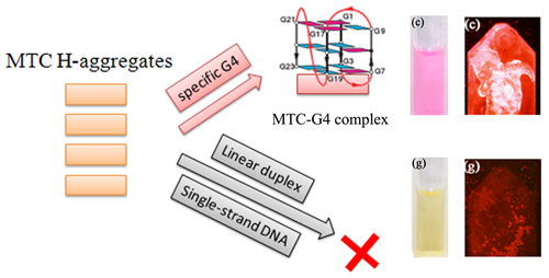 菁染料聚集体在溶液和界面识别特定DNA G-四链体结构示意图