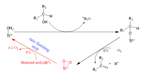 光催化反应过程中分子氧的作用及其活化机理是该研究领域的一个关键科学问题。此前,该研究组利用同位素标记等实验研究TiO2 光催化氧化醇类分子时,发现在反应过程中醇分子中的氧原子完全被氧分子中的一个氧原子所置换(置换率>99%)生成相应的羰基化合物。基于顺磁共振、氧同位素标记拉曼光谱、动力学同位素效应等实验结果,提出了与以往贵金属等催化氧化机理完全不同的TiO2光催化反应氧原子交换机理(Angew. Chem. Int. Ed., 2009, 48, 6081-6084,被选为封面论文)。在进一步研究反应的微观机理和速率限制步骤中,他们发现在TiO2表面吸附Bronsted酸能够大大加快醇类分子光催化转化,由于掺杂SiO2能增加酸的吸附位点,当用Bronsted酸对TiO2/SiO2复合光催化剂进行表面修饰后加速作用进一步加强,速率限制步骤得到证实。表面光谱及动力学分析表明质子能够有效促进在光催化活化分子氧过程中TiO2表面形成的Ti-过氧化物中间物种的分解,进而使得表面光催化活性位点再生,因此加速了光催化循环和反应。该研究有助于深入理解TiO2光催化活化分子氧的微观机理,为今后制备新型光催化剂和调控光催化反应提供了重要的科学依据。