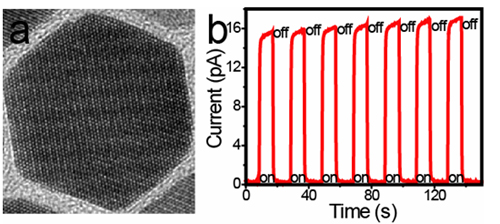 图 1. (a) CuInSe2纳米颗粒的透射电镜照片 (b) CuInSe2纳米颗粒与P3HT杂化器件的开关特性曲线