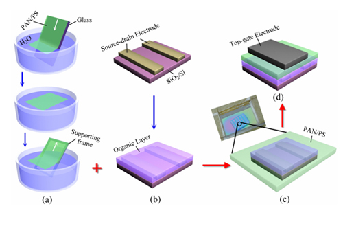 图2. 由自支撑绝缘层制备顶栅结构的有机场效应晶体管示意图