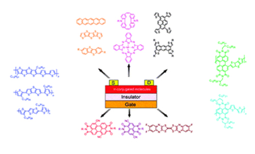 有机半导体的主体结构是具有p结构的共轭体系,目前分子结构与性能之间的关系尚在探索中,还没有行之有效的设计原则。研究人员经过多年的摸索和不断总结(J. Am. Chem. Soc., 2005, 127, 13281; J. Am. Chem. Soc., 127, 15700; J. Am. Chem. Soc., 128, 15940; J. Am. Chem. Soc., 2006, 128, 16418; J. Am. Chem. Soc., 2007, 129, 1882; Adv. Mater., 2007, 19, 3037; Adv. Mater., 2008, 20, 611; Adv. Mater., 2008, 20, 1286; Adv. Mater., 2008, 20, 3289),对分子结构、凝聚态结构对器件性能影响及器件的优化有了一些认识,这些结果得到学术界同行的认可,英国皇家化学会Chemical Society Reviews发表了题为“p-Conjugated molecules with fused rings for organic field-effect transistors: design, synthesis and applications” 的Tutorial Review (Chem. Soc. Rev., 2010, 39, 1489-1502) ,系统地介绍了他们该小组近几年来在稠环p共轭分子的设计、合成和在有机场效应晶体管中的应用(图3)。