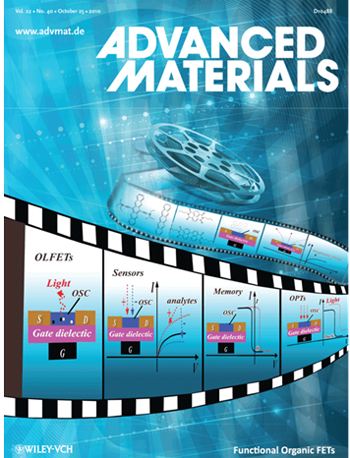 功能性有机场效应晶体管将扩展OFET应用领域,化学所有机固体院重点实验室研究人员在这方面做了深入的研究,制备了高性能的有机薄膜,单晶的光晶体管器件以及多比特存储的有机场效应晶体管存储器件(Appl. Phys. Lett., 2009, 94, 143303; Adv. Funct. Mater., 2010, 20, 1019-1024; Adv. Mater., 2009, 21, 1954-1959)。最近,他们应《先进材料》杂志邀请撰写了综述性论文“Functional Organic Field-Effect Transistors”,并以内封面(图4)的形式发表(Adv. Mater. 2010, 22, 4427-4447)。