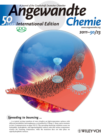 在中国科学院、国家自然科学基金委和科技部的支持下,化学所有机固体院重点实验室研究人员研究了特定温度下,液滴在高温固体表面发生的浸润/去浸润转变现象,并对相关机理进行了阐述,相关研究结果发表在近期的《德国应用化学》(Angew. Chem. Int. Ed. 2011, 50, 5311-5314)上并被选为封面论文和very important paper(VIP)做了专门介绍。