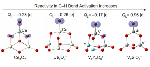 科研人员首先提出定义“氧缺陷指数”对金属氧化物团簇进行分类(Theor. Chem. Acc. 2010, 127, 449),实验结合理论发现其中一类团簇(该指数为1的团簇)以氧原子自由基为反应活性中心与甲烷(Chem. Commun. 2010, 46, 1736)等非常稳定的小分子在室温下发生化学反应;进一步发现了氧分子吸附中的单电子转移是氧自由基自发产生的重要机制(J. Phys. Chem. A ,2010, 114, 10024; 2011, 115, 10245)。通过研究二元复合氧化物团簇,发现在一系列团簇中氧自由基与主族元素铝(Chem. Eur. J. 2011, 17, 3449)、硅(J. Phys. Chem. C, 2010, 114, 12271; Chem. Eur. J. 2010, 16, 11463 / VIP article)、磷(Phys. Chem. Chem. Phys. 2010, 12, 12223)而并非与过渡金属元素钒成键,这表明V2O5/Al2O3、V2O5/SiO2等催化剂中的载体成分也可能会参与表面化学反应。通过深入分析氧自由基的反应性,发现了团簇上氧自由基局部的自旋密度分布(Phys. Chem. Chem. Phys. 2010, 12, 3984; J. Phys. Chem. C. 2011, 115, 13329)和局部的电荷分布(Chem. Eur. J. 2011, 17, 11728)可以显著影响自由基与一氧化碳、烷烃等分子反应的速率,这为调控氧自由基与稳定小分子的反应活性与选择性建立了理论基础。