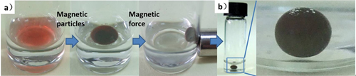 在国家自然科学基金委、科技部、中国科学院和化学所的支持下,化学所高分子物理与化学实验室的科研人员受贻贝和荷叶的启发,将海洋附着生物的强粘附特性与荷叶表面微纳多级结构结合,发展了一种利用具有贻贝粘附蛋白仿生结构的多巴胺修饰微粒表面,进而制备微纳多级结构超疏水颗粒的通用制备方法。此种方法操作简单,反应条件温和,可大规模制备。该方法可对直径从几百纳米到几微米,从亲水到疏水的多种颗粒改性;也可将不同组成和尺寸的微粒在“一锅”中改性得到超疏水颗粒。应用这种普适性方法修饰具有不同功能的微粒,可赋予功能颗粒超疏水特性,拓展材料的功能与应用,例如,通过这种方法制备的磁性超疏水超亲油颗粒,能实现油水分离并在磁场控制下对油相进行输运。同时,还首次发现所包覆的油相能在水下自发形成珠滴并稳定存在几个月以上,这种新型水下珠滴在微反应器和传感器方面有潜在的应用。相关结果发表于J. Am. Chem. Soc., 2012,134, 9879–9881.