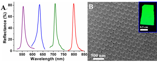 在国家自然科学基金委、科技部和中国科学院的支持下,化学所有机固体和新材料实验室的科研人员针对目前光子晶体制备和应用开展了广泛研究(Acc. Chem. Res. 2011, 44, 405-415; J. Mater. Chem. 2011, 21, 14113-14126)。他们通过结构设计,制备了具有硬核-软壳结构的乳胶粒,制备了具有特殊紧密堆积结构的高强度光子晶体(Macromol. Chem. Phys., 2006, 6, 596-604, Cover)。利用这种具有特殊乳胶粒结构的胶体晶体实现了在高灵敏度检测(Angew. Chem. Int. Ed. 2008, 47, 7258-7262;J. Mater. Chem. 2012, 22, 21405-21411; Lab Chip 2012, 12, 3089-3095)、光信息存储(Adv. Mater. 2010, 22, 1237-1241, highlighted by Asia Materials),界面浸润性调控(Adv. Funct. Mater. 2011, 21, 4436-4441. Cover))等方面的应用,并实现了单晶光子晶体膜的制备(NPG Asia Mater.2012, 4, e21)。