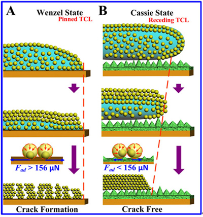 图2 在高粘附基底(A)和超疏水低粘附基底(B)组装的机理示意图