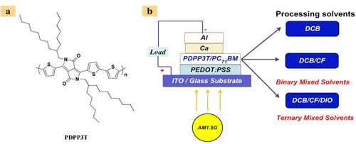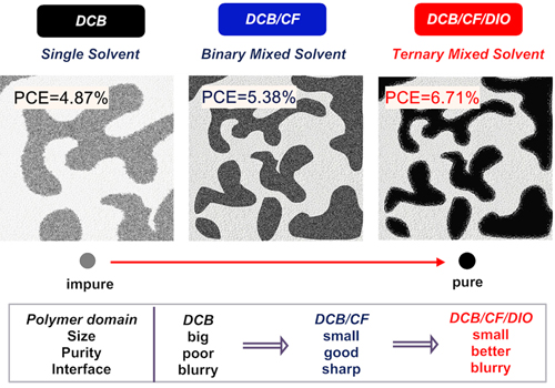 近年来,形貌的优化成为进一步提高聚合物太阳能电池能量转换效率的关键问题,尽管二元混合溶剂(一般是主溶剂和添加剂组成)对给受体的结晶行为和相区大小的调节已取得良好的效果,而它对更精细的形貌参数,如相区纯度、相区界面的调节还无能为力。
