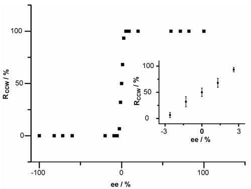 图2 表面逆时针手性网格结构随溶液相中(S)-2-甲基辛醇过量程度的非线性放大曲线
