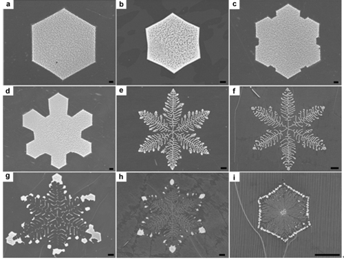 单晶石墨烯的形貌调控和刻蚀。实现单晶石墨烯的制备和对其边界结构的调控是石墨烯可控制备研究中广泛认同的前沿课题。后一目标尤其面临着缺乏理论指导和具体解决方案的双重挑战。化学所有机固体实验室的研究人员在前期利用液态铜表面的各向同性CVD法制备正六边形单晶石墨烯的基础上(Proc. Natl. Acad. Sci. U. S. A., 2012, 109, 7992),通过对石墨烯成核成长微观动力学过程的调控(Ar和H2比例的连续调控),首次获得了一系列新的热力学上石墨烯亚稳结构(图2)。这一系列具有高度六重对称性的石墨烯的形貌遵循着确定的变化规律:石墨烯的边界变化包含了从正曲率到负曲率变化的完整范围。这一石墨烯图案体系与自然界中的雪花结构集合有着惊人的相似,代表了已知材料中唯一完美地以更加简单(雪花为三维晶体)的二维方式再现雪花结构集合的范例。基于以上事实,进一步提出了扩散控制的普遍生长机制,并与理论模拟相吻合。这一工作首次将石墨烯的生长和形貌调控与非平衡体系下动力学上的调控联系起来,揭示了石墨烯生长中的一个从未被发现但普遍存在的基本规律,原理上可推广到更广泛的二维原子晶体材料。相关工作发表在自然出版社集团旗下的《亚洲材料》(NPG Asia Mater.,2013, 5, e36)上。