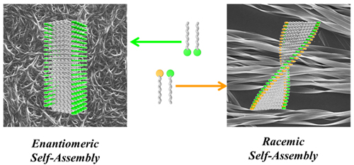 图1 丙氨酸衍生物的单一对映体(左)与外消旋体(右)组装模式与形成的纳米结构示意图。