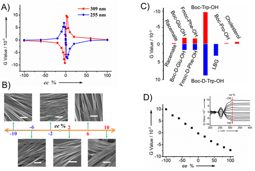 图2 不同对映体过剩(ee)条件下外消旋体组装的A) CD信号强度变化和B)形貌变化。外消旋组装体对C)不同氨基酸衍生物和D)不同ee值的色氨酸衍生物的响应。