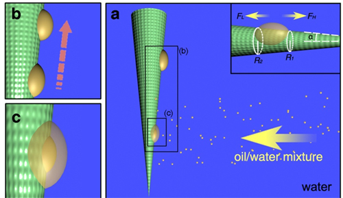 研究人员通过对自然中生物特性的研究,发现仙人掌刺在雾气流中可以连续的集水,刺表面收集的水滴可以被其表面的结构自驱动向刺的根部。受此启发,雾气中的水滴和油水混合物中的油滴是相似的,如果模拟仙人掌刺的结构,将有可能在油水分离上实现“边收集边驱动”这一智能循环模式。于是,研究人员用具有水下亲油性质的材料制备了锥形的针尖,并模拟仙人掌刺来构筑其表面的微米-纳米复合粗糙结构。将其放入含有微小油滴的油水混合物液流中并观察。由于材料本身的疏水亲油性质,油水混合物在流经锥形针尖时,混合物中的微小油滴会被吸附到针尖上,慢慢形成较大的油滴;锥形针尖表面的油滴由于曲率不同,会受到拉普拉斯压差的作用,即受到一个指向锥形根部的驱动力,当针尖收集的油滴越长越大,这个驱动力会自发地将油滴驱动至锥形根部储存。这个油滴被驱动走后,露出的针尖表面又会开始下一个集油的循环,实现连续的油水分离(见图1)。这种“边收集边驱动”的分离技术是一种智能的新型油水分离模式,将有这种功能的针尖做成大面积的阵列(见图2),就实现了连续高效的油水分离,分离的效率可达99%以上,而且这种技术的高通量、环境友好、耐腐蚀等特性,也是传统分离方法所难以实现的。这一研究为新型油水分离方法的设计提供了新的思路,对世界范围内环境、石油工业的发展有重要意义。