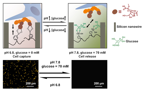 进一步,研究人员通过表面引发的链转移聚合反应将苯硼酸基聚合物刷引入到硅纳米线表面,制备了对pH值和葡萄糖双重响应界面(J. Am. Chem. Soc. 2013, 135, 7603, 图2)。当pH 6.8时,苯硼酸聚合物与癌细胞表面的唾液酸残基的结合常数远大于苯硼酸聚合物与葡萄糖的结合常数,从而可以特异性癌细胞粘附。而当pH值升高到7.8时,苯硼酸聚合物与葡萄糖之间的结合常数大于其与唾液酸之间的结合常数,使粘附的癌细胞可以从表面释放下来。这样通过改变pH值和葡萄糖浓度,就实现了双响应的癌细胞特异粘附和去粘附的有效调控。同时,这个温和调控过程对细胞没有明显的损伤,细胞活性保持在95%以上。该研究为复杂生命体系中癌症检测与靶向药物传输提供了理论基础。