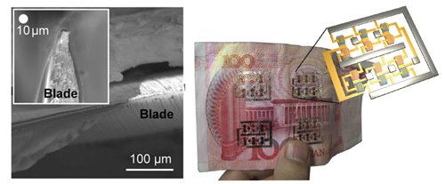 图1 左: 表面覆盖320纳米有机场效应晶体管的刀刃的扫描电镜照片,插图为侧视图。右:自支撑的五阶环形振荡器和转移到百元人民币衬底上照片。
