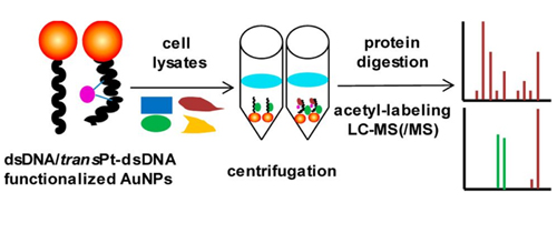 图1 功能化纳米金亲和探针-质谱联用从细胞裂解液中捕获和鉴定特异性识别金属药物损伤DNA的蛋白质的流程示意图