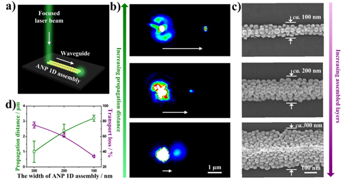 在以上研究的基础上, 他们通过构筑微米尺度的模板结构,实现了对基材表面液膜破裂行为的控制,得到了形貌可控的微米线状高分子图案(Small 2013, 9,722-726)。进一步将对液膜破裂的控制与打印过程中的液滴调控相结合,利用咖啡环效应成功得到线宽为5-10 μm的金属纳米粒子图案(Adv. Mater. 2013, 25,6714-6718)。基于以上研究成果,他们提出了一种通过控制液膜破裂实现了多种纳米粒子大面积精确组装的普适方法(图1),并研究了银纳米粒子组装后在等离子光波传输方面的应用(图2)。这种新型图案化技术可以简便地进行纳米粒子微、纳米尺度图案的精确组装,可以通过“印刷”方式大面积制备纳米粒子组装的精细图案和功能器件,乃至实现单个纳米粒子的组装与图案化,对印刷技术的功能化和器件化发展具有重要意义。该研究结果发表在近日出版的(Adv. Mater. 2014, 26,2501-2507)上, 并被选为封面论文,前期已申请国际(PCT)发明专利。