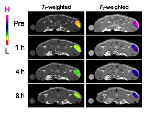 最近,在基金委、科技部和科学院的资助下,该课题组深入研究了表面修饰对磁性纳米颗粒弛豫性质的影响机制。他们首先设计合成了三种末端具有不同螯合基团的PEG2000配体,通过配体置换,得到了Fe3O4核心尺寸相同但表面修饰结构不同的生物相容性纳米颗粒。研究发现,配体螯合基团的共轭结构可显著增强Fe3O4纳米颗粒的T2磁共振造影性能。然后结合理论分析,他们深入探讨了配体螯合基团对Fe3O4纳米颗粒的磁共振造影性能的影响机制。一般来讲,减小Fe3O4纳米颗粒的尺寸可有效提高其T1造影性能,但同时会减弱其T2造影效果。然而,利用配体螯合基团效应,在减小纳米颗粒尺寸获得优异T1造影性能的同时,可最大限度地保持小尺寸Fe3O4纳米颗粒的T2造影效果。最后,利用异羟肟酸PEG修饰的3.6 nm Fe3O4纳米颗粒作为磁共振造影剂,成功实现了活体肿瘤的T1和T2双模态磁共振成像检测。相关研究工作已经在近期被接受发表,见Adv. Mater., 2014, 26(17), 2694-2698。