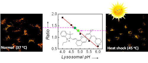 进一步通过发展新型光学探针,该课题组研究了热休克过程中溶酶体的pH与温度的变化关系(图 1)。众所周知,热休克等与热相关的疾病严重危害人类的健康,而且,酸性亚细胞器溶酶体的微小pH变化可影响到细胞的自动平衡调节、蛋白质降解、浆膜修复等生理过程。然而,温度与溶酶体pH之间的基本变化关系目前还不清楚,这主要是缺乏相应的有效研究手段。针对这一问题,该课题组将亚细胞器溶酶体的识别基团引入到稳定的半菁骨架中,发展了具有精确的溶酶体靶向功能、优良的光稳定性以及比率型响应的近红外pH光学探针;结合荧光共聚焦成像技术,研究并揭示出溶酶体的pH随着温度的升高而升高,而且这种升高过程在短时间内是不可逆的。该研究阐明了在热休克过程中溶酶体的pH值与温度的变化关系,相关结果发表在 Angew. Chem. Int. Ed. (2014, 53, 10916-10920)上。