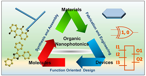 微纳体系的结构与组成决定其光子学行为,构筑特定功能的微纳光学元件对于集成光子学有着重要的意义。近期,在科学院先导项目(B类)等的支持下,光化学实验室科研人员在特定功能有机光子学器件的可控组装方面取得了新进展。他们基于前期工作基础,总结了有机分子的相互作用、组装行为、聚集结构、以及光子学功能之间的关系,进而以功能为导向,从光功能分子的设计合成出发,通过分子的可控组装,实现了特定功能光子学器件的设计和构筑。(图1)(Chem. Soc. Rev., 2014, 43, 4325-4340,Acc. Chem. Res., 2014, 47, 3448?3458)。