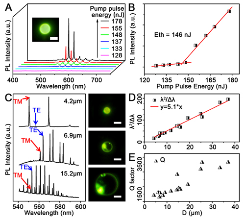 在闭合腔体的边界内, 光可以一直被囚禁在腔体内部保持稳定的行波传输模式。在弯曲的圆形或盘状腔体内光波可以不断地在弯曲光滑的腔壁反射而损耗很小,这种效应被称为回音壁模式 (Whispering Gallery Mode, WGM)。回音壁模式光学微腔因为具有非常高的品质因子(Q值),因此可用于高质量谐振腔,配合上有机染料的高的光学增益性质,有望实现高性能的微纳激光。最近,研究人员在深入理解有机分子组装特性的基础上,从分子间相互作用对有机分子自组装行为的影响着手,利用表面活性剂微乳液作为模板,诱导有机高分子和染料分子的协同组装,制备了尺寸可控的复合微盘结构。微盘结构可以作为高质量的谐振腔,其Q值达到104量级,远远超过现有的有机腔结构,他们通过控制组装参数实现了对微盘结构和掺杂组分的控制,并得到了模式可控的WGM激光(图2)。进一步根据WGM激光应用中的可控输出的要求,通过控制组装过程中的相分离行为,得到了微盘与纳米线的复合结构。利用线、环微腔之间的耦合效应,实现了WGM激光从纳米线端点的可控定向输出。