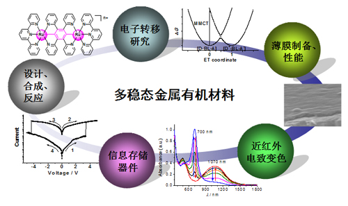 在过去几年中,化学所光化学院重点实验室研究人员围绕多稳态金属有机材料的设计合成、电子转移、薄膜制备与性能、近红外电致变色、信息存储等方面开展工作(图1)。合成了一系列具有良好氧化还原活性的桥联环金属钌配合物及三芳胺化合物。由于金属和桥联配体之间以碳-金属键相连,金属的氧化还原电位显著降低,氧化还原中心之间存在较强电子相互作用。此类材料具有多稳态的性质,通过近红外吸收光谱和顺磁信号可以对每种状态进行区分。在混合价状态下,材料呈现较强的价间电荷转移近红外吸收。相应化合物的电聚合薄膜显示较好的近红外电致变色现象,并具有操作电压低,记忆时间长,对比率高,响应时间短等特点(Coord. Chem. Rev. 2013, 257, 1357; Chem. Sci. 2014, 5, 932; Chem. Sci. 2015, 6, 1308)。以羧基为锚定基团,可以在ITO电极表面制备相应配合物的自组装单层膜,成功实现分子层次的近红外电致变色及触发器(flip-flop)存储功能(J. Am. Chem. Soc. 2015, 137, 4058)。