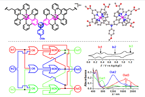 最近,在国家自然科学基金委、科技部和中国科学院的支持下,科研人员设计合成了新型三芳胺桥联的双钌金属配合物,并通过单晶衍射证实了该类配合物的分子结构(图2)。此类化合物在较低电位处具有三步单电子可逆氧化还原过程(+0.21, +0.44, +1.03 V vs Ag/AgCl),即具有四个稳定可逆氧化还原状态,并且每个状态都具有特征近红外吸收。在端基配体上连接乙烯基后,通过电化学还原聚合在ITO电极表面制备得到相应配合物的聚合物薄膜。薄膜厚度可控(10~200 nm),粘附性好,配位环境得到完全保留。该薄膜具有多步近红外电致变色现象。此外,以+0.35 V、+0.75 V和+1.30 V电压为输入信号(In1, In2, In3),以相应三个氧化还原状态的特征吸收为输出信号(Out3@1680 nm; Out2@1170 nm; Out1@750 nm),实现薄膜状态的flip-flap-flop多态信息存储 (Angew. Chem. Int. Ed. 2015, 54, 9192)。