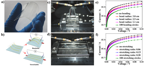 在这些研究的基础上,他们通过喷墨打印技术构筑微米尺度的电极图案作为“模板”,控制纳米材料的组装过程成功制备了最高精度可达30nm的图案(图1),并实现了柔性电路的应用(图2)。这种新型的图案化技术非常简便地实现了功能纳米材料的微纳米精确图案化组装,在过程中完全避免了传统的光刻工艺,这种“全增材制造”的方法通过“先打印,再印刷”的方式,能够大面积制备纳米材料组装的精细图案和功能器件,是“绿色纳米印刷技术”在前沿科学领域实现的一大突破,对印刷技术的功能化和器件化发展有着重大的推动作用。该研究成果发表在近日出版的Adv. Mater. 2015, 27, 3928-3933上。