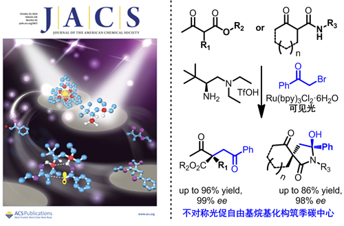 当手性伯叔二胺与光敏催化剂协同作用时,则可以实现该类化合物的不对称自由基烷基化反应,从而可以构筑极具挑战性的手性全碳取代季碳中心。值得注意的是,当底物采用α-取代-β-酮酰胺时,在该条件下可以一步构筑含两个季碳中心的螺环化合物,该类物质同样具有诱人的药物活性。该工作被JACS选为封面文章进行报道 (J. Am. Chem. Soc., 2014, 136, 14642-14645),并被JACS spotlight点评为“简单且强力的不对称烷基化手段,在解决药物和天然产物化学所面临的挑战问题方面极具潜力” (JACS spotlight, 2014, 136, 14627)。