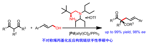 当手性伯叔二胺与过渡金属钯催化协同作用时,α-取代-β-酮酯类化合物可以与烯丙醇类化合物发生不对称烯丙基化反应,可得到含不饱和双键的全碳取代链状手性季碳中心,进一步丰富了该类化合物的转化潜力和应用前景(图4, Angew. Chem. Int. Ed., 2015, 54, 12645-12648)。