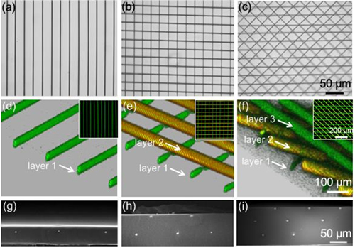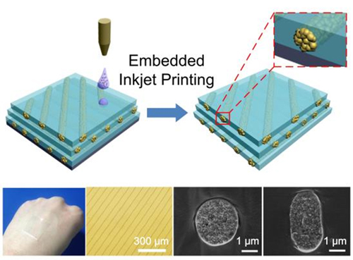 在以上研究基础上,他们通过在可聚合液态基材上打印含有纳米颗粒的导电墨水,巧妙地利用液态基材对打印墨滴的动态包裹作用,实现了高精度嵌入式导电银线的直接制备。由于喷墨打印导电墨水粘度和表面张力的影响,实现其在另一种液体内部融合成线非常具有挑战性。他们通过调控液态基材的流变行为和纳米银导电墨水的性质解决了这一问题,实现了液态基材对墨滴的可控包裹,有效抑制了墨滴的扩散和“咖啡环”效应(图1)。基此,利用喷孔孔径为25μm的普通商用打印机制备了线宽约1-2 μm的导电银线,比通常的喷墨打印精度提高了约20倍。所制备的高精度电路直接嵌入在基材内部,避免了后续的封装步骤。电学测试表明这种方法制备的嵌入式微型电缆具有优异的导电性能。他们进一步利用这种“液膜嵌入式打印”,采取逐层叠加的方式直接打印实现了多层电路的制备,达到了60μm透明薄膜内嵌入三层电路的集成度(图2)。