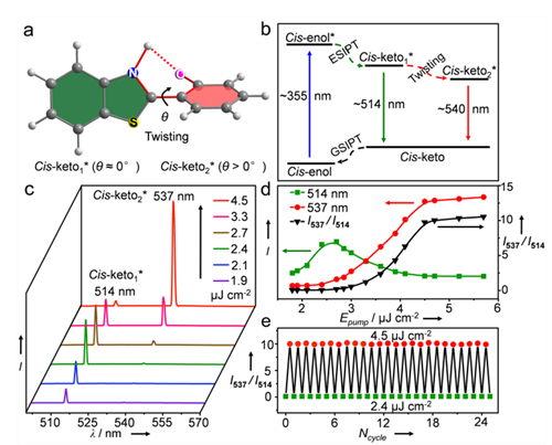 图1. 基于激发态分子内质子转移过程的波长可切换有机微纳激光