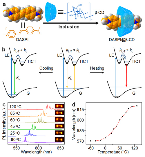 进一步,研究人员选择具有分子内电荷转移(ICT)特性的化合物作为增益材料来构筑有机微纳激光。这类化合物具有两个上能级,而且能级结构和激发态过程对不同的环境有特定的响应。首先通过超分子限域体系设计,实现了两个上能级布居数的控制。进一步通过稳态与瞬态光谱分析,提出了基于两个上能态协同增益的全新的激光产生机制,这种机制提供了一种通过控制两个上能态间的粒子数分布来调控增益区间的新思路。基于此,通过实时改变环境温度来控制分子内电荷转移过程,有效地调控了有机超分子微晶的增益区间,进而实现了发射区间连续可调的宽谱微型激光器(图2)。相关研究成果发表于美国化学会志(J. Am. Chem. Soc. 2016,138, 1118-1121)。