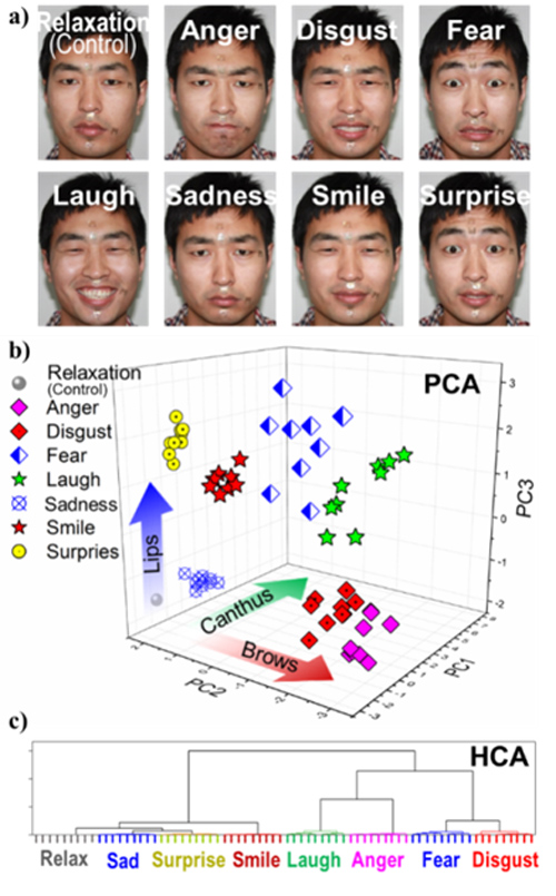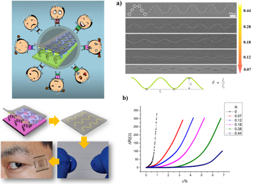 在以上研究基础上,他们突破传统印刷技术中模板和精度的局限,利用微米柱阵列作为“印版”,与含有纳米颗粒的“油墨”及柔性基材构筑了类似传统印刷过程中“印版、油墨和纸张”的三明治结构。随着溶剂的挥发,气-液-固三相接触线有序收缩,纳米颗粒在基材上组装形成周期与振幅精确可控的微米乃至纳米尺度的导电曲线阵列,进而得到对微小形变有灵敏电阻响应的传感器(图1)。将传感器贴在被监测者的皮肤上进行数据采集与分析,可以实时监测不同环境和心理条件下人体体表微形变的相关生理反应,如复杂表情识别(图2),并有望应用于脉搏监测、心脏监护和远程操控等领域。这种高精度、高灵敏传感器的印刷制造方法突破了传统印刷技术的精度极限,将有力推动印刷制造可穿戴电子和其它微纳米功能器件的发展和应用。该研究成果作为VIP文章发表在近日出版的《先进材料》Adv. Mater.2016,28, 1369-1374上。