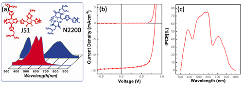 图1 (a) 给受体聚合物材料的分子式和吸收光谱图;(b) J51: N2200器件的电流密度-电压曲线;(c)外量子转化效率。